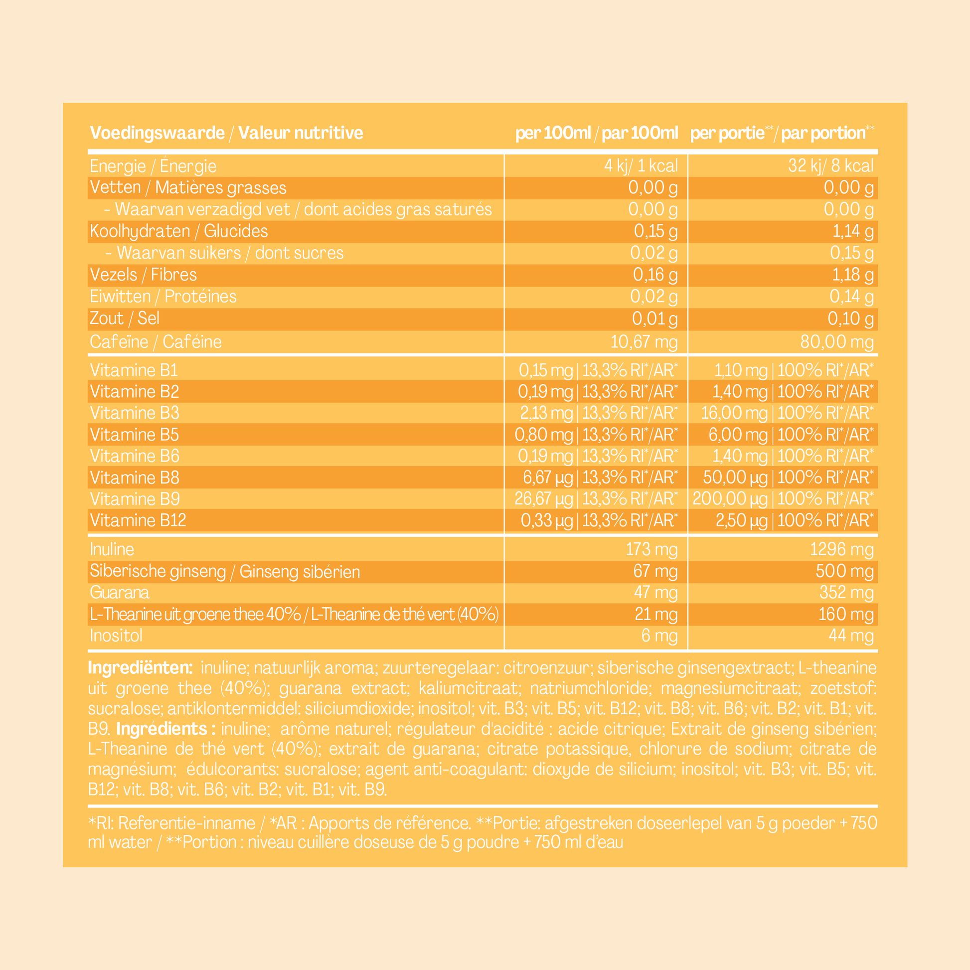Informatie: Bevat cafeïne (80 mg per afgestreken maatlepel of 10,67 mg per 100 ml oplossing bereid volgens de instructies). Bevat zoetstoffen (sucralose). Niet aanbevolen voor kinderen onder de 12 jaar en zwangere vrouwen. Niet gebruiken tijdens zwangerschap of borstvoeding. Vervangt geen gevarieerde en evenwichtige voeding noch een gezonde levensstijl. Koel en droog bewaren, buiten bereik van jonge kinderen. De aanbevolen dagelijkse dosis (1 portie) niet overschrijden. Kan sporen van gluten, ei, pinda’s en verschillende soorten noten en zaden bevatten. Goed sluiten na gebruik.
