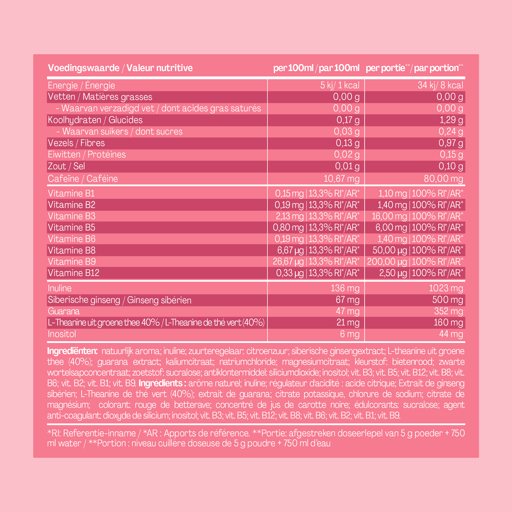 Informatie: Bevat cafeïne (80 mg per afgestreken maatlepel of 10,67 mg per 100 ml oplossing bereid volgens de instructies). Bevat zoetstoffen (sucralose). Niet aanbevolen voor kinderen onder de 12 jaar en zwangere vrouwen. Niet gebruiken tijdens zwangerschap of borstvoeding. Vervangt geen gevarieerde en evenwichtige voeding noch een gezonde levensstijl. Koel en droog bewaren, buiten bereik van jonge kinderen. De aanbevolen dagelijkse dosis (1 portie) niet overschrijden. Kan sporen van gluten, ei, pinda’s en verschillende soorten noten en zaden bevatten. Goed sluiten na gebruik.