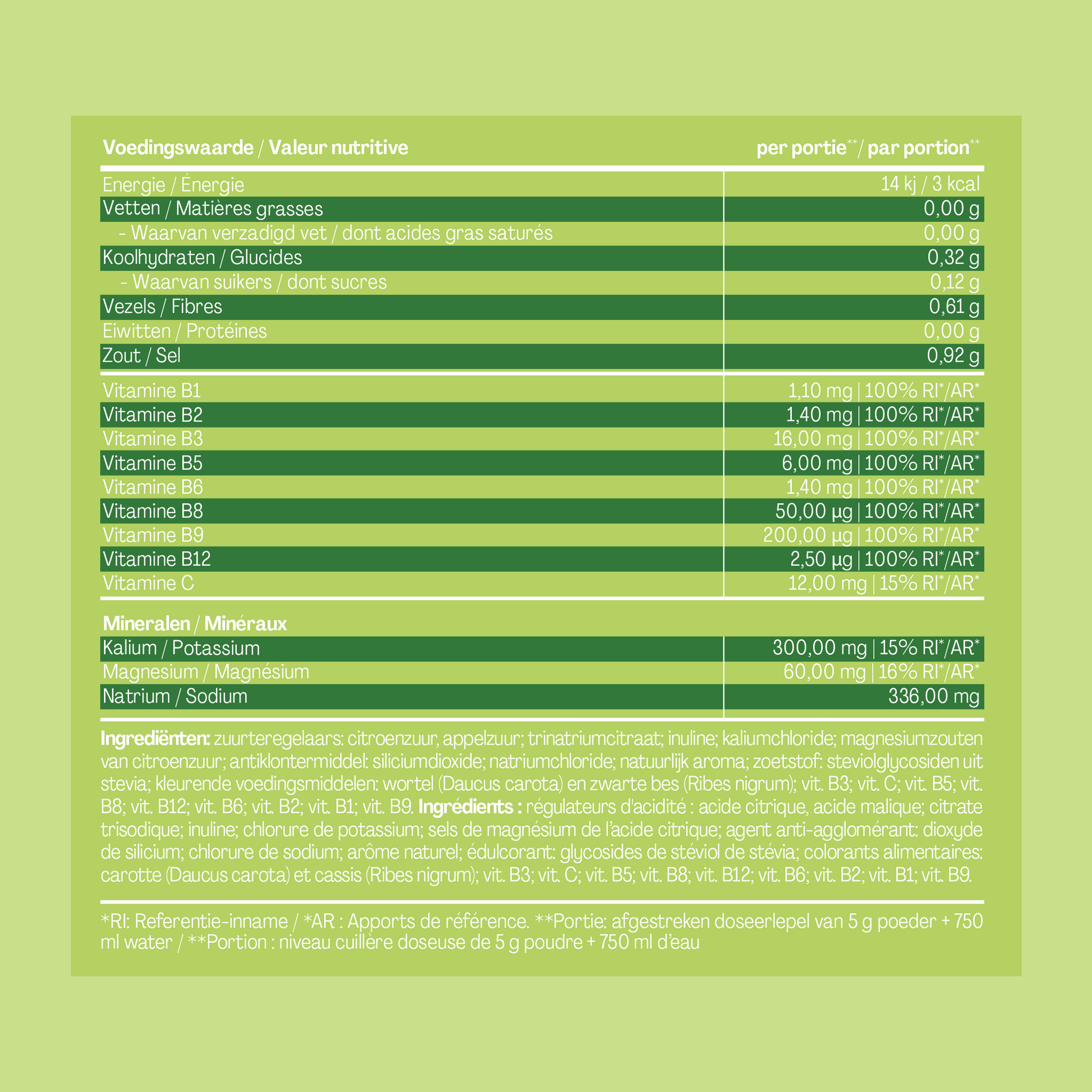 Aanbevolen gebruik: Meng één afgestreken maatschep (5 g poeder) met 750 ml water. Schudden voor gebruik.