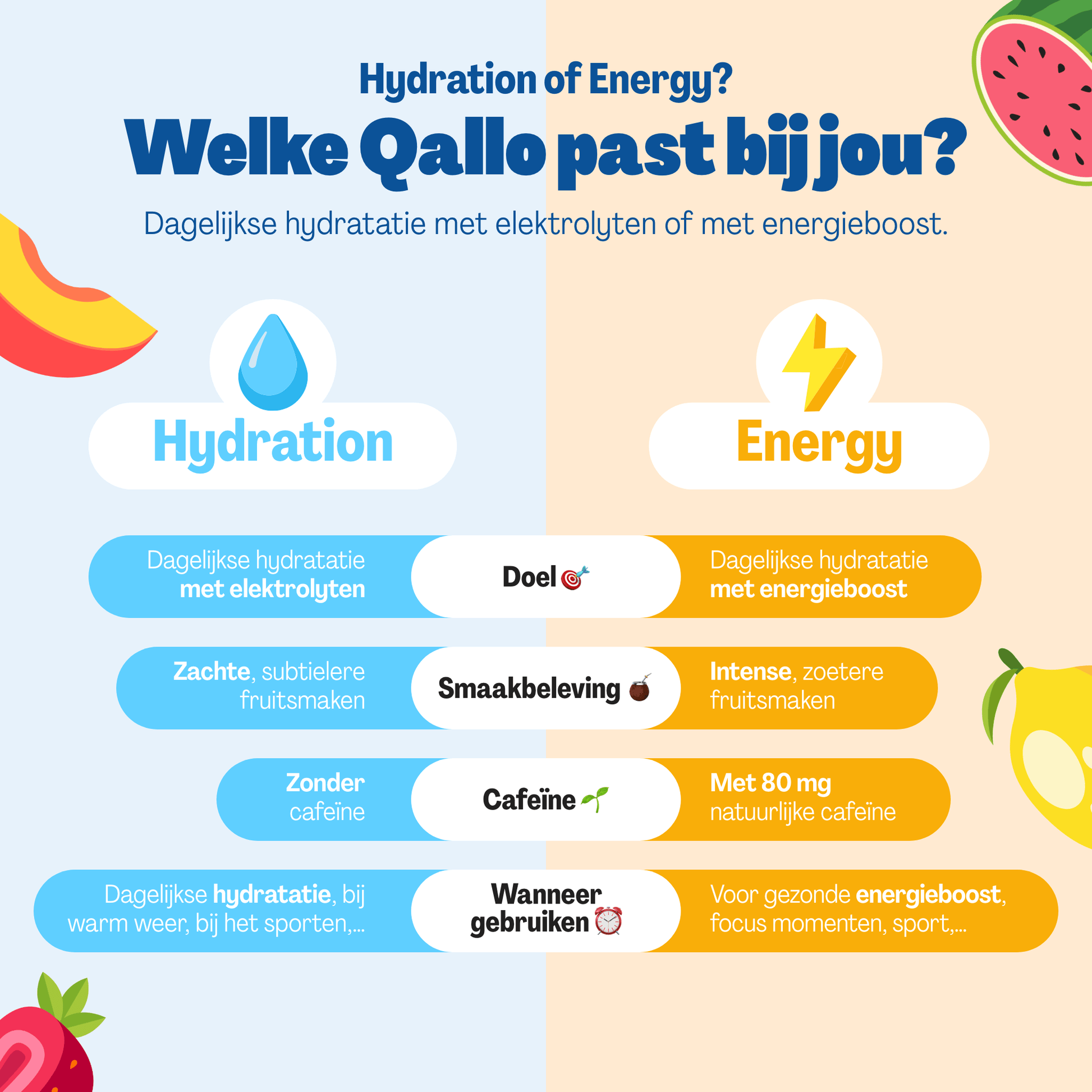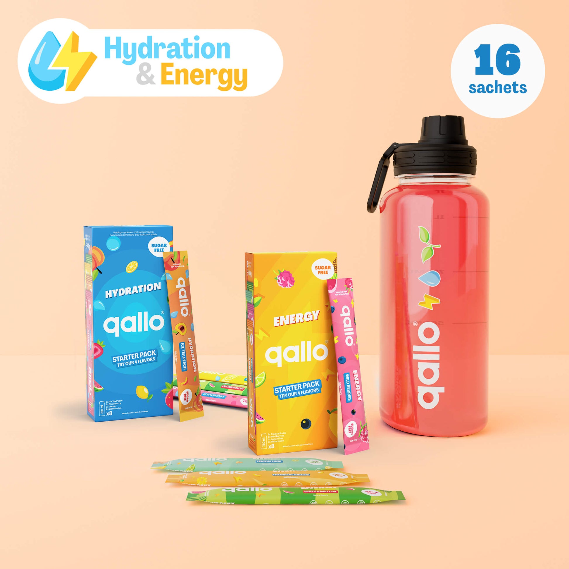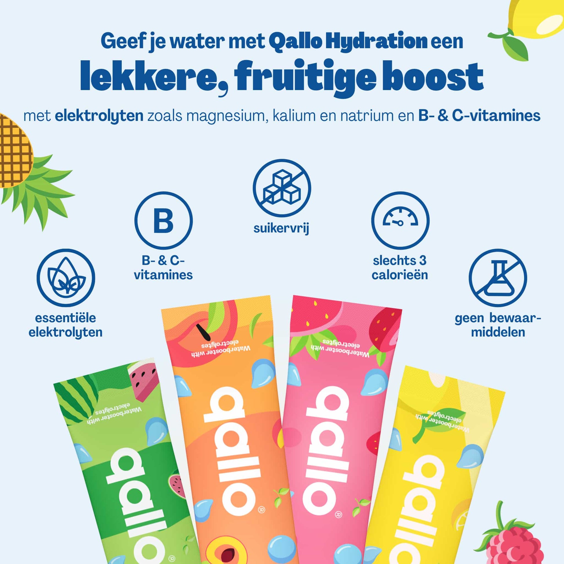 Qallo zorgt niet alleen voor meer smaak in je water, maar ook voor extra functie. Of je nu extra hydratatie nodig hebt of een zachte energieboost, Qallo helpt je erdoor. Onze formules zitten boordevol elektrolyten, essentiële B-vitamines en natuurlijke ingrediënten die je lichaam ondersteunen.