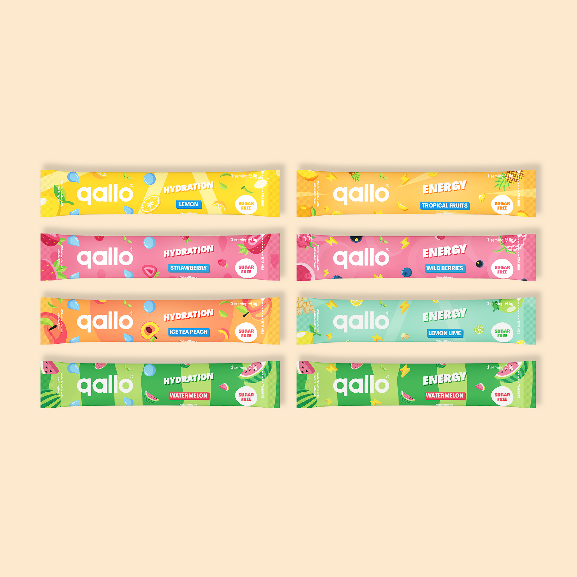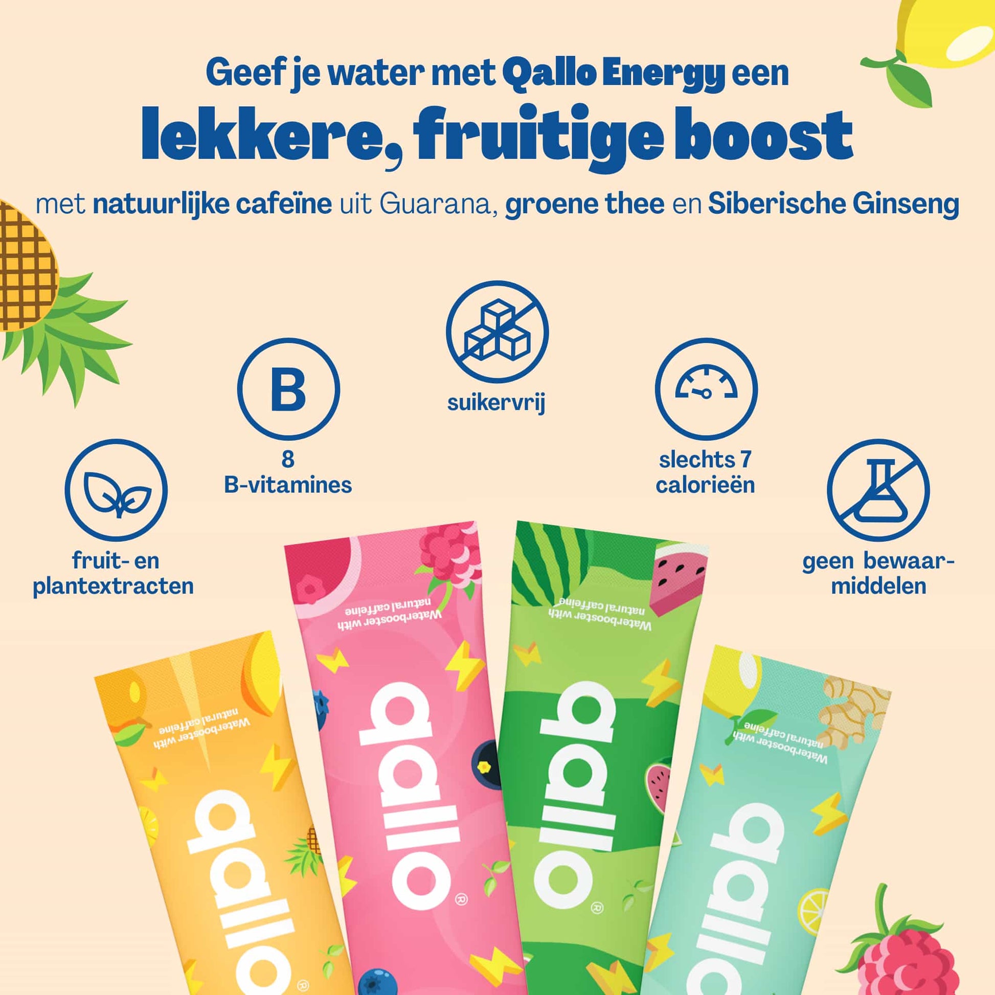 Qallo helpt je meer water te drinken. Slimmer. Met of zonder cafeïne. Altijd suikervrij, vegan én fruitig van smaak.