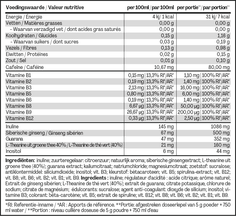 Information: Contains caffeine (80 mg per level measuring scoop or 10.67 mg per 100 ml solution prepared according to instructions). Contains sweeteners (sucralose). Not recommended for children under 12 years and pregnant women. Do not use during pregnancy or breastfeeding. Does not replace a varied and balanced diet or a healthy lifestyle. Store in a cool and dry place, out of reach of young children. Do not exceed the recommended daily dose (1 serving). May contain traces of gluten, eggs, peanuts, and various types of nuts and seeds. Close well after use.